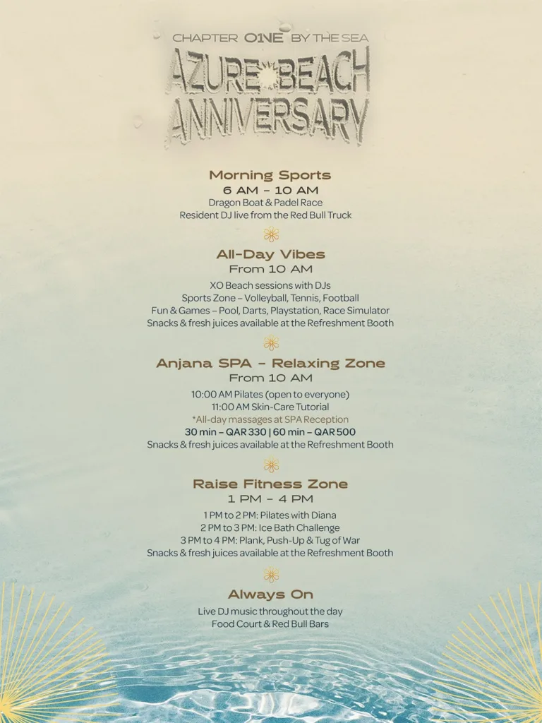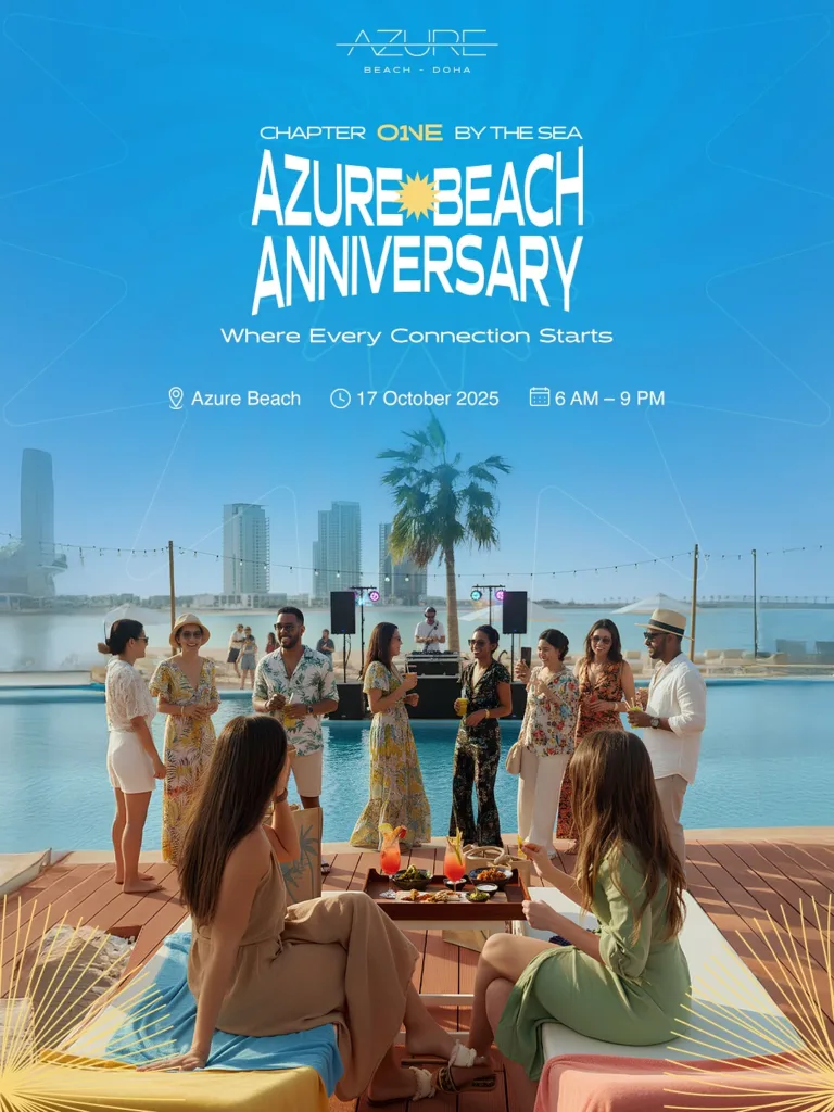 Azure Beach Doha will mark its first anniversary with a full-day celebration designed to bring together sport, wellness, entertainment, and lifestyle in one unforgettable beachfront experience. Guests are invited to enjoy a vibrant programme of activities from sunrise to evening, reflecting Azure’s dynamic spirit and commitment to creating exceptional leisure moments in the heart of Qatar.