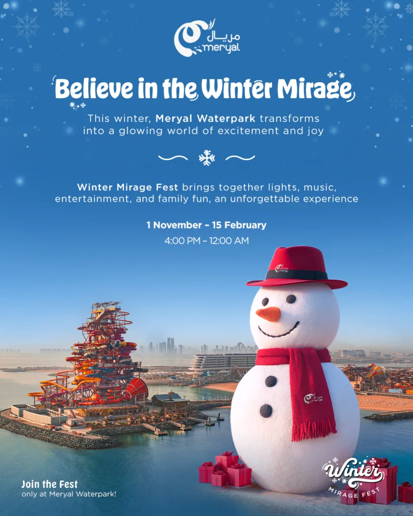 Set against the vibrant backdrop of Meryal Waterpark, the Winter Mirage Fest promises an immersive celebration where families, friends, and guests of all ages can enjoy a season filled with wonder, joy, and unforgettable experiences, transforming the park into a truly unique winter escape by the sea. With the Winter Mirage Fest, Meryal Waterpark continues to solidify its position as a cultural and entertainment landmark in Qatar, delivering creative seasonal experiences that combine authenticity, storytelling, and world-class hospitality.