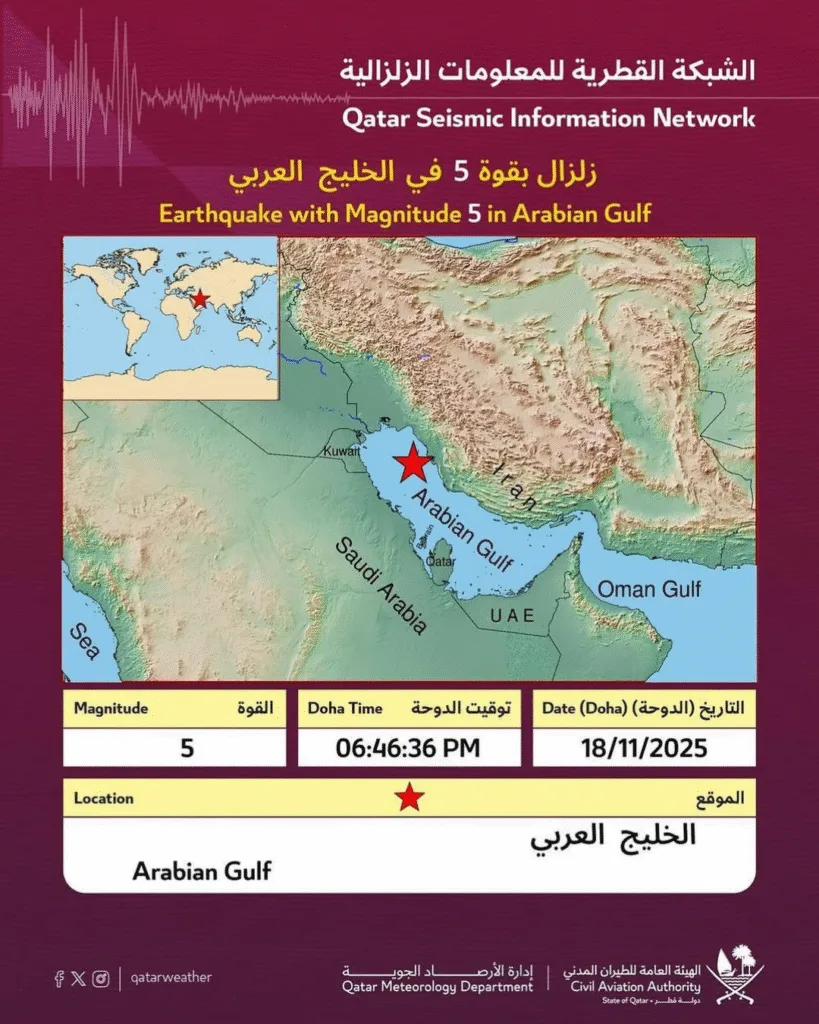 A 5.0-magnitude earthquake struck the Arabian Gulf on 18 November 2025 at 6:46:36 PM Doha time, according to an official bulletin released by the Qatar Seismic Information Network, part of the Qatar Meteorology Department. The seismic event occurred offshore, but its effects were widely felt across the Gulf region, prompting residents in multiple countries to report light to moderate tremors.