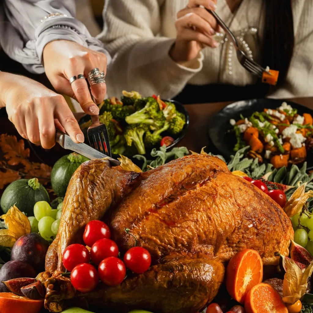 Enjoy a beautifully curated festive meal with refined flavors and signature desserts. Options include a perfectly roasted turkey or a complete feast bundle.