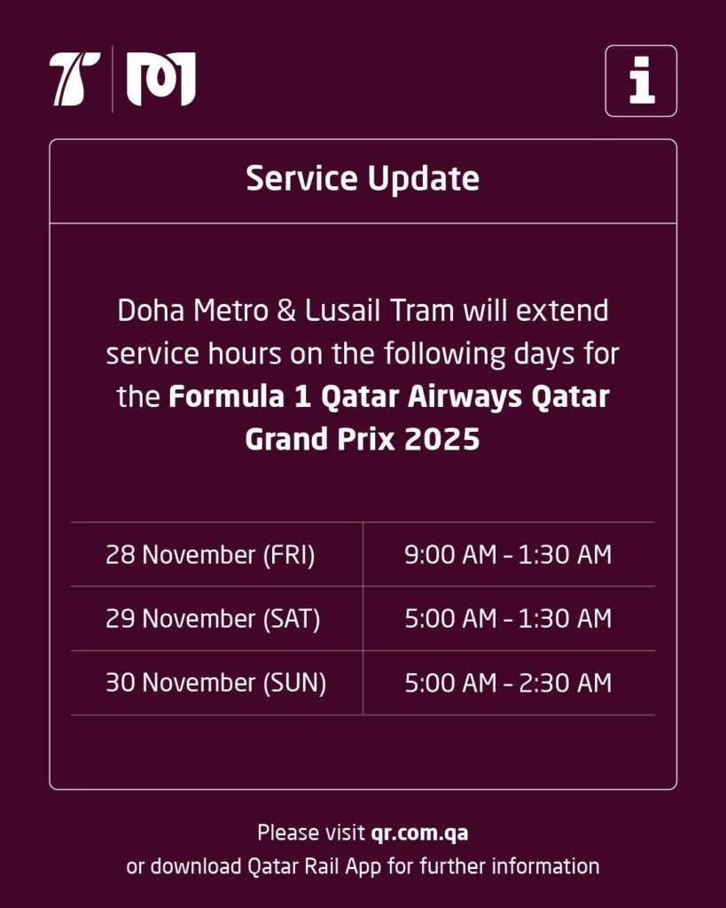 Doha Metro and Lusail Tram have officially announced extended service hours to support spectators attending the highly anticipated Formula 1 Qatar Airways Qatar Grand Prix 2025. The move aims to ensure smooth and efficient transportation for fans travelling to and from the Lusail International Circuit during the race weekend.