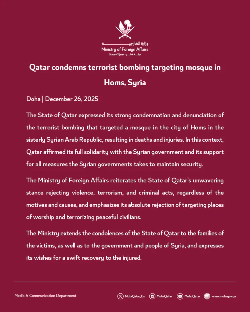 The State of Qatar has issued a strong condemnation of the terrorist bombing that targeted a mosque in Homs, Syria, resulting in fatalities and injuries. The statement reaffirms Qatarās rejection of terrorism and violence, its support for Syriaās security efforts, and its firm stance against attacks on places of worship.