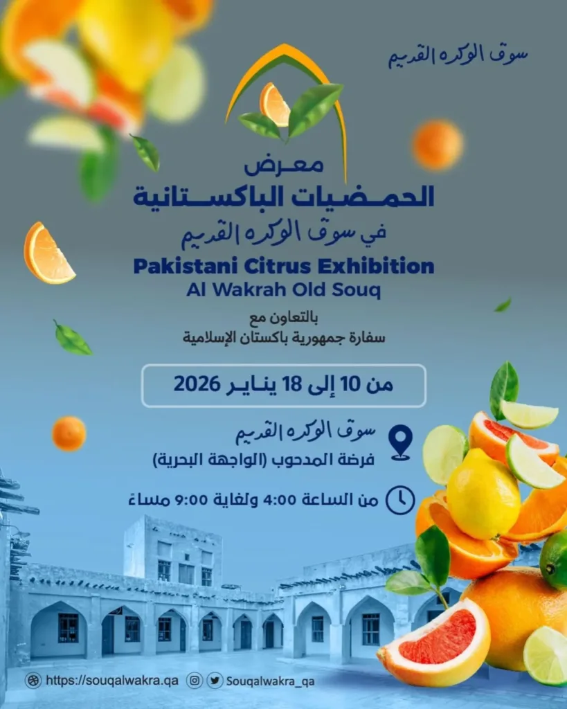 Experience the vibrant taste of Pakistan’s premium citrus produce at the Pakistani Citrus Exhibition, taking place at Al Wakrah Old Souq. Organised in cooperation with the Embassy of the Islamic Republic of Pakistan, this seasonal exhibition celebrates fresh flavours, quality produce, and cultural exchange.