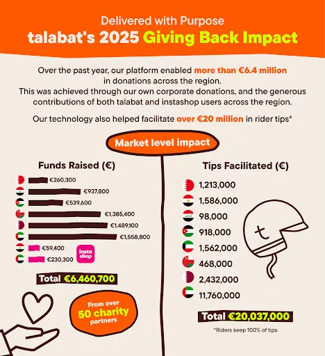 Giving Back and rider tipping are permanent features of talabat’s digital platform, designed to make giving simple, traceable and scalable. Funds and in-kind contributions flow directly to partners and riders, without any platform retention.