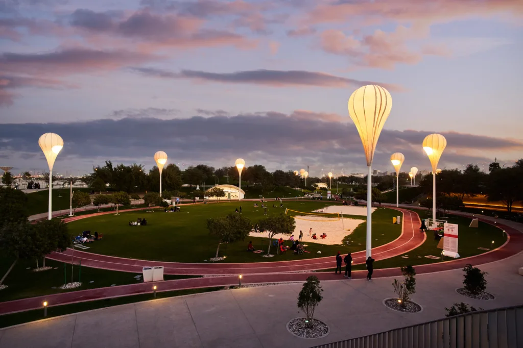 Education City, designed by AECOM, sunken jogging tracks lit at night. Oxygen Park is the runner’s park. Smooth tracks, no crowds, multi-purpose pitches. Best for: anyone training for something.