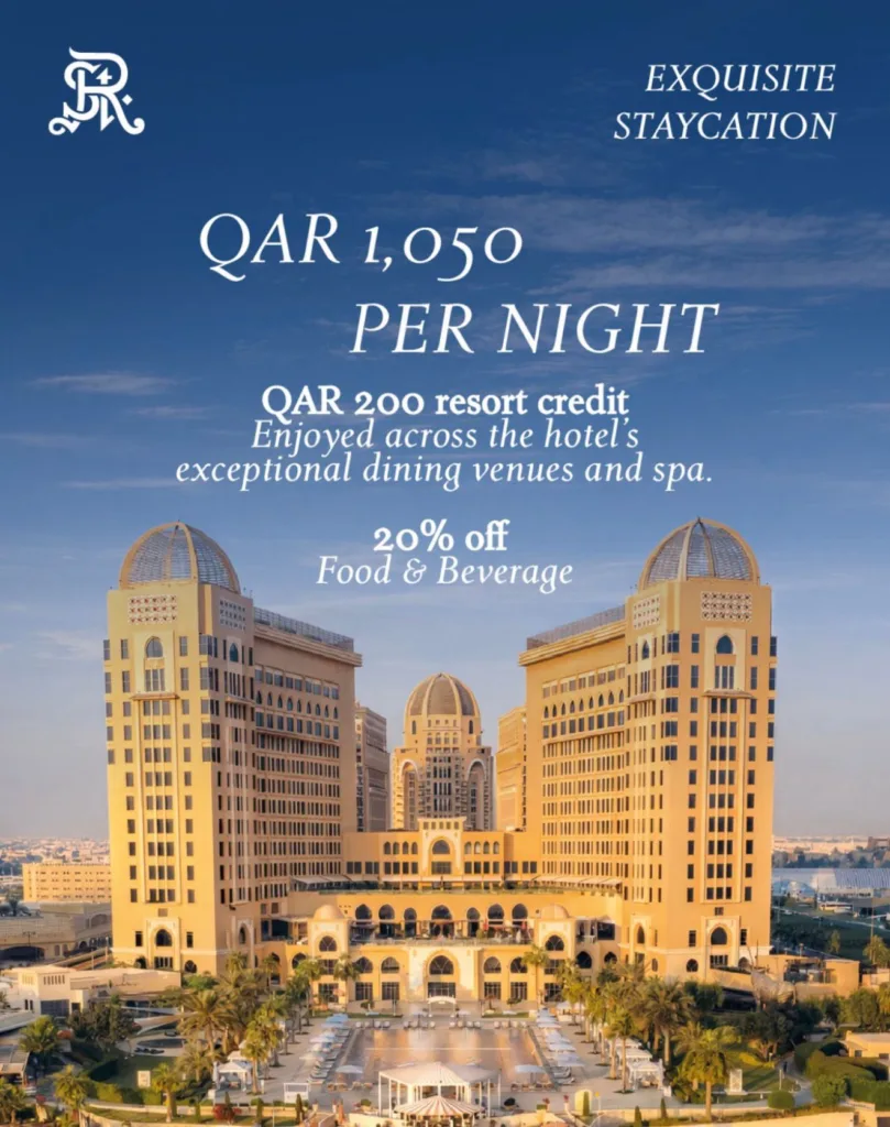 Enjoy an Eid staycation at The St. Regis Doha from QR 1,050/night, includes QR 200 resort credit for restaurants or spa and 20% off Food & Beverages.